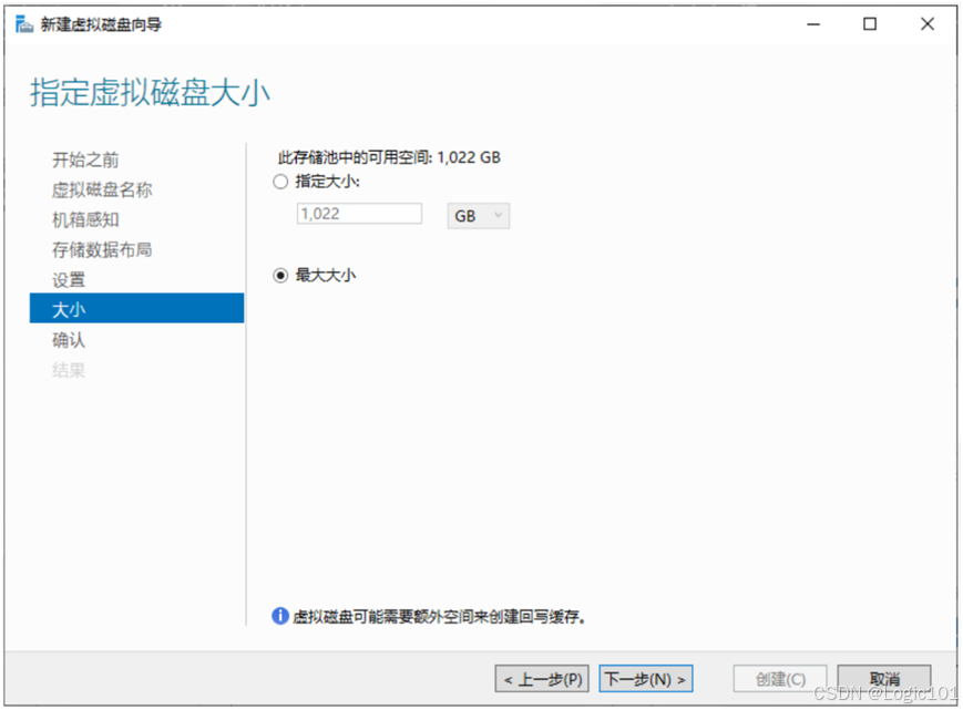 (6)在【指定虚拟磁盘大小】中选择为【最大大小】,单击【下一步】,确认无误后单击【创建】,如下图所示。