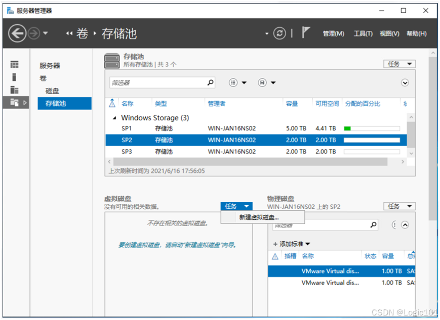 (1)在存储池配置界面的虚拟磁盘窗口中,单击【任务】下拉菜单,选择【新建虚拟磁盘】,如下图所示。