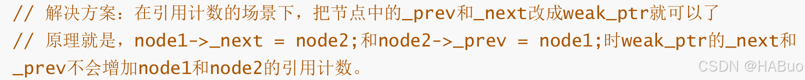 现在来进一步分析:当main函数调用完,node2会先析构,但是此时引用计数是2所以不会释放空间而是将计数变为1。然后node1再析构,同上,它的引用计数也减为一,但是这两份空间并不会释放,因为要node2的prev释放后,node1的空间才会释放,那node2的prev什么时候释放?答案是node2这份空间释放了才会释放prev,那么node2这份空间什么时候释放?答案是node1的next释放了它才释放,这就形成了一个死循环,我等你释放了我才能释放,对方也在等我释放了对方才能释放,这就是"循环引用问题"