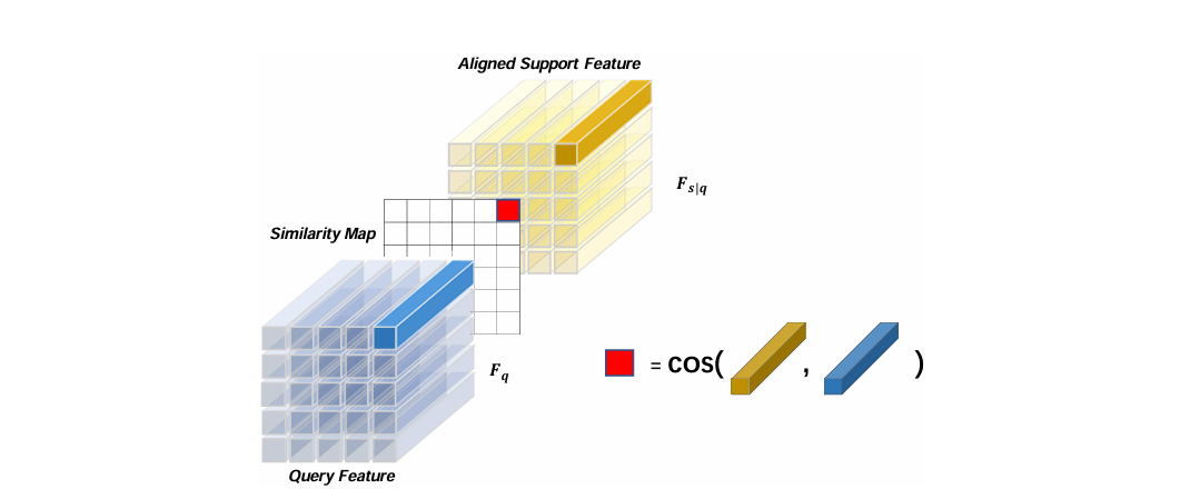 - 逐元素计算余弦相似度:对对齐后的支持特征和查询特征,按 “局部特征块”(图中黄色 / 蓝色小方块)逐点计算余弦相似度(图中红色块代表 cos 计算);