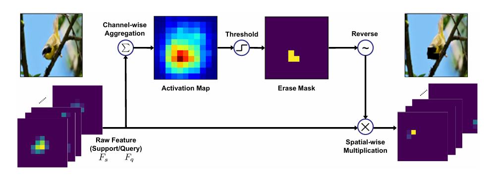 - 特征擦除:用擦除掩码和原始特征图做空间级相乘(Spatial-wise Multiplication),把原始特征中 “过度激活的局部区域” 擦除;