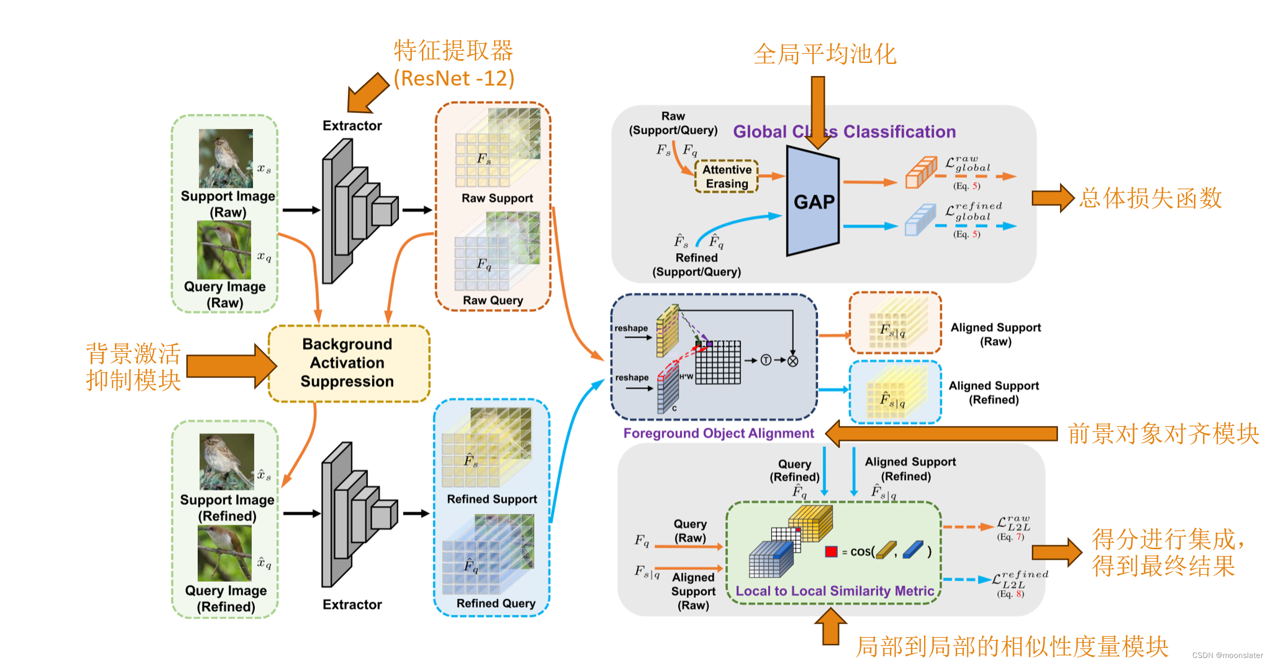- 机制:FOA模块根据支持样本与查询样本的匹配关系,重建支持样本的特征图,以对齐查询样本的特征图。