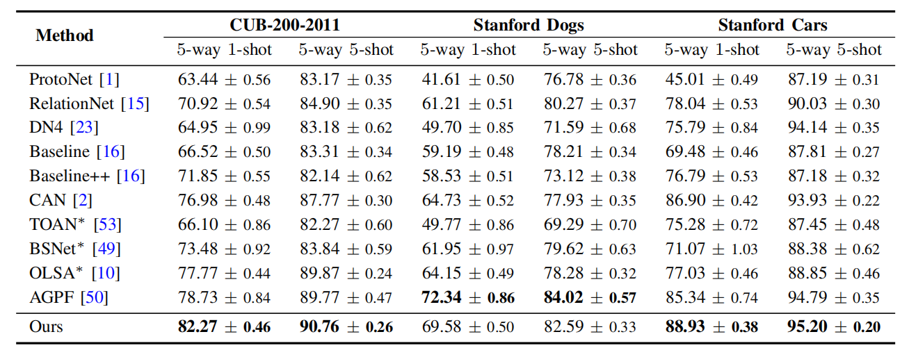 - 基线与对比方法:包括传统 FSL 方法(ProtoNet、RelationNet、DN4)与专用 FS-FGR 方法(TOAN、BSNet、OLSA、AGPF),确保公平对比。