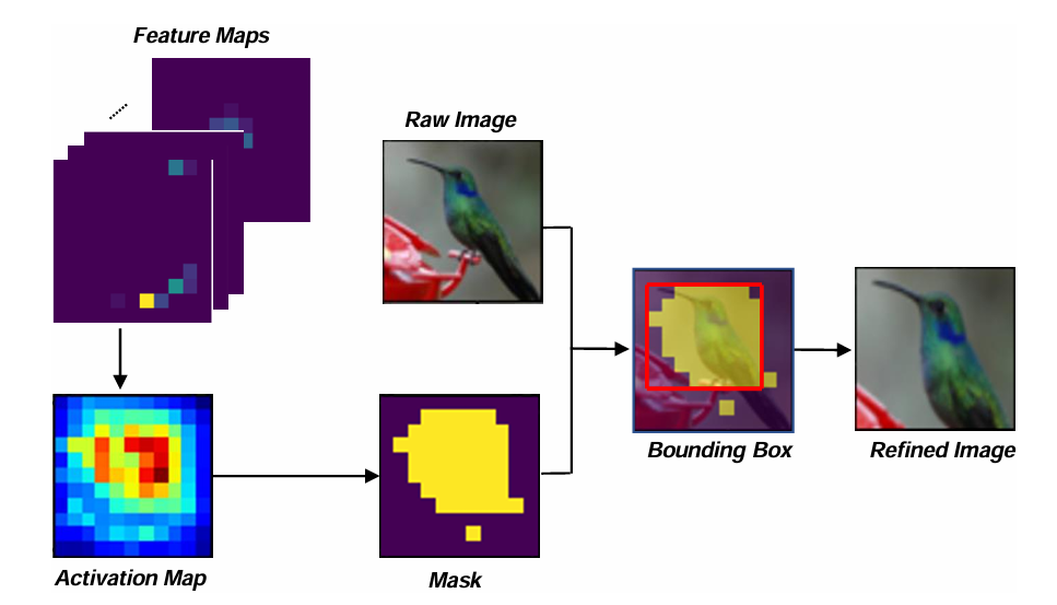 - 生成优化图像(Refined Image):用前景掩码在原始图像上框出前景边界框(Bounding Box),裁剪并放大前景区域,最终得到 “去除背景干扰的优化图像”。