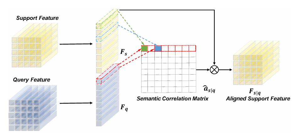 - 输入特征:原始的支持特征(\(F_s\),黄色块)和查询特征(\(F_q\),蓝色块)—— 此时二者的前景特征(比如图中绿色 / 蓝色小方块)因姿态差异,在特征图中的位置是错位的;