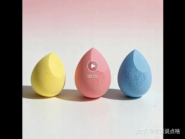 画面内容:马卡龙色系 3 个装美妆蛋特写快速切入,背景浅粉色渐变,无杂乱元素