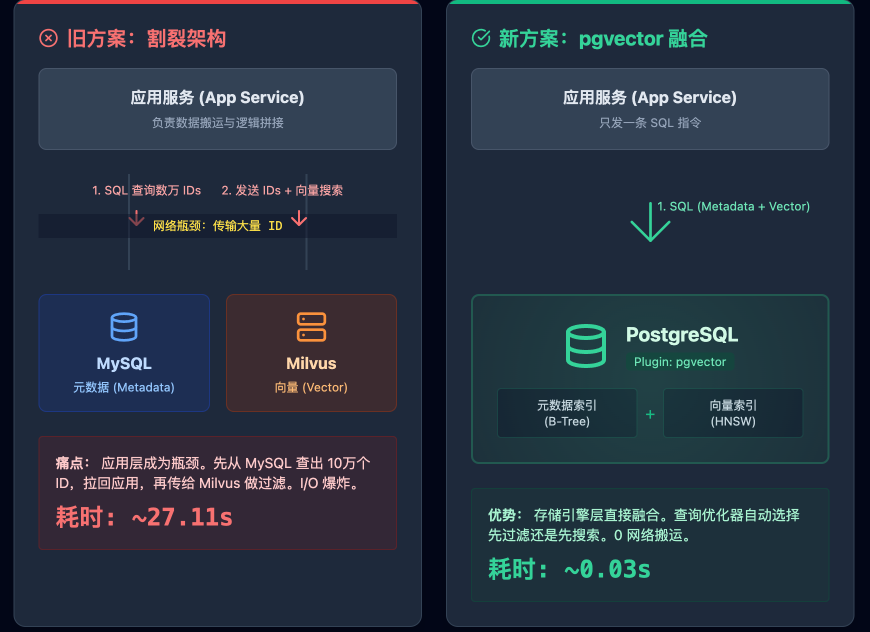 这次从 Milvus 到 PostgreSQL 的迁移,不仅是一次性能优化,更是一次架构的回归与简化。