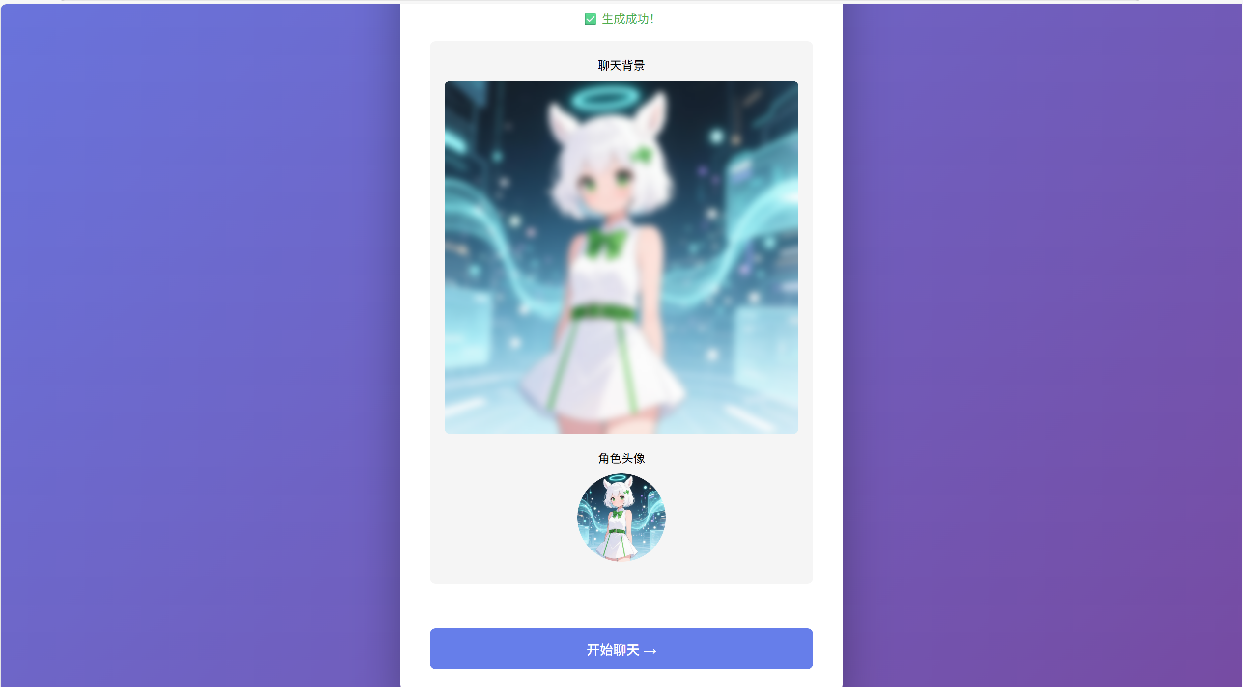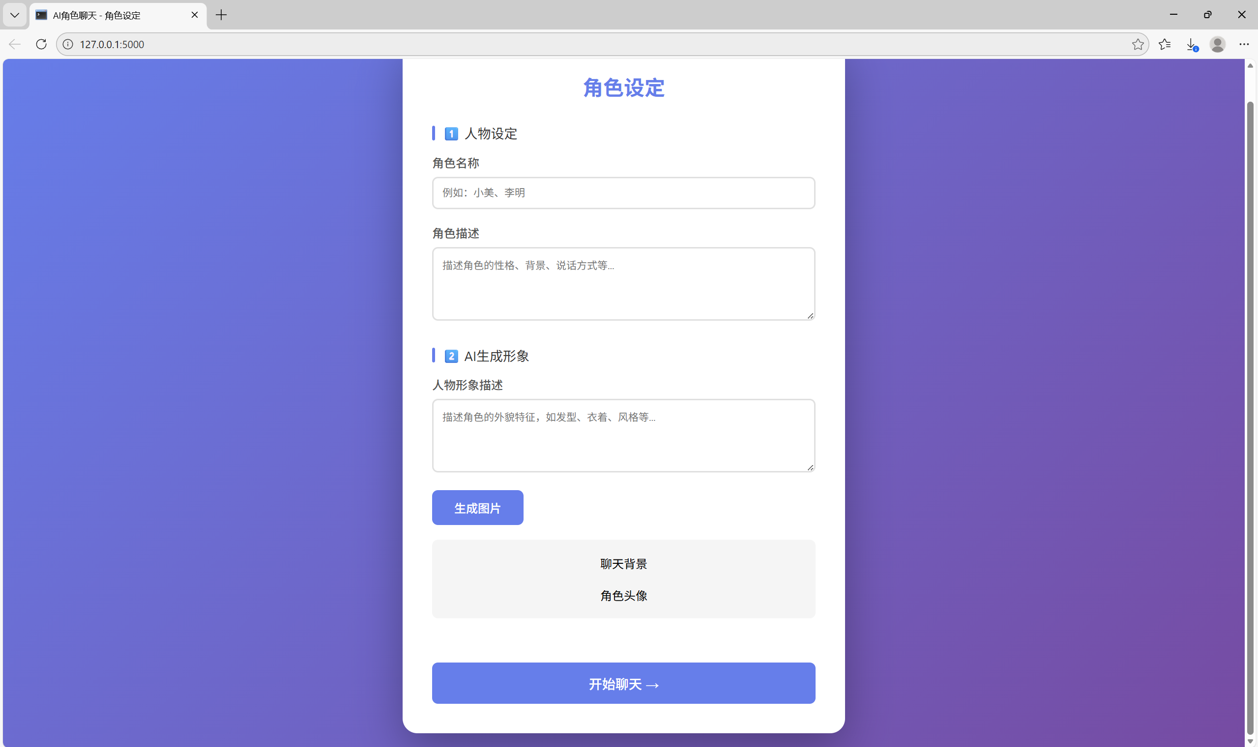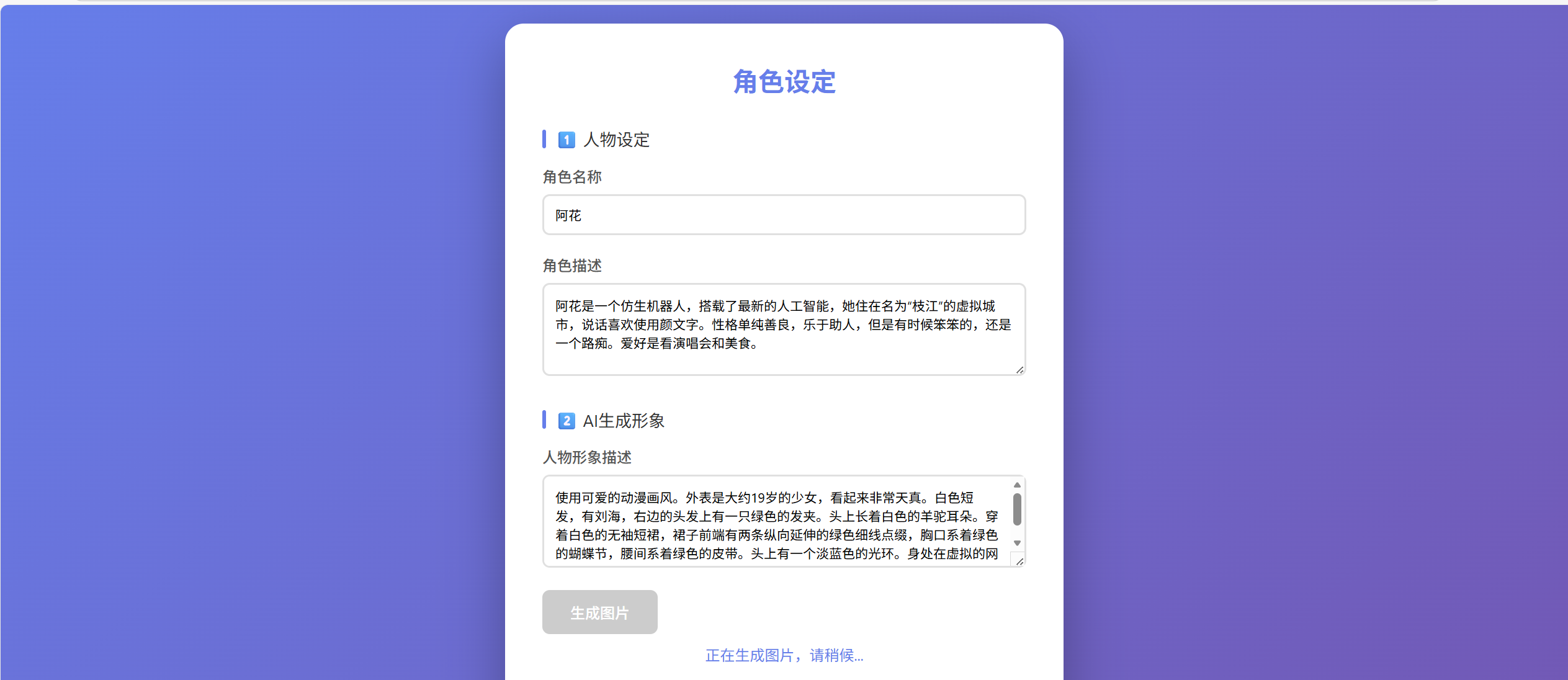 它会返回一个网址,点进去就是聊天界面,需要用户自行输入角色名称、角色描述以及人物形象描述。