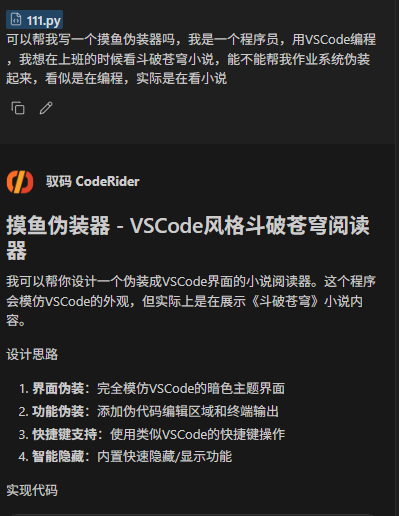 虽然我使用做了一个不太实用的工具,但在这个过程中,我切实深入地了解了AI 智能体(代理)对生产力的变革。以前:我有想法 -> 查PyQt文档 -> 查键盘监听库 -> 写UI -> 调Bug -> 甚至放弃。现在:我有一个想法 -> CodeRider 拆解任务 -> 自动生成 -> 自动纠错 -> 落地。它把从“灵感”到“产品”的历程走了90%。谁能想到,这个设计用来帮助企业保障代码安全、进行自