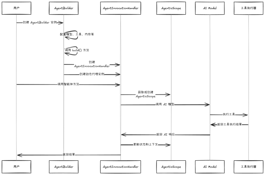 AgentBuilder使用Java动态代理来拦截智能体方法调用。这就像在智能体和实际执行之间设置了一个"智能门卫",当用户调用智能体接口的方法时,实际执行的是代理对象的逻辑,代理对象会根据需要处理请求、调用AI模型、执行工具等。