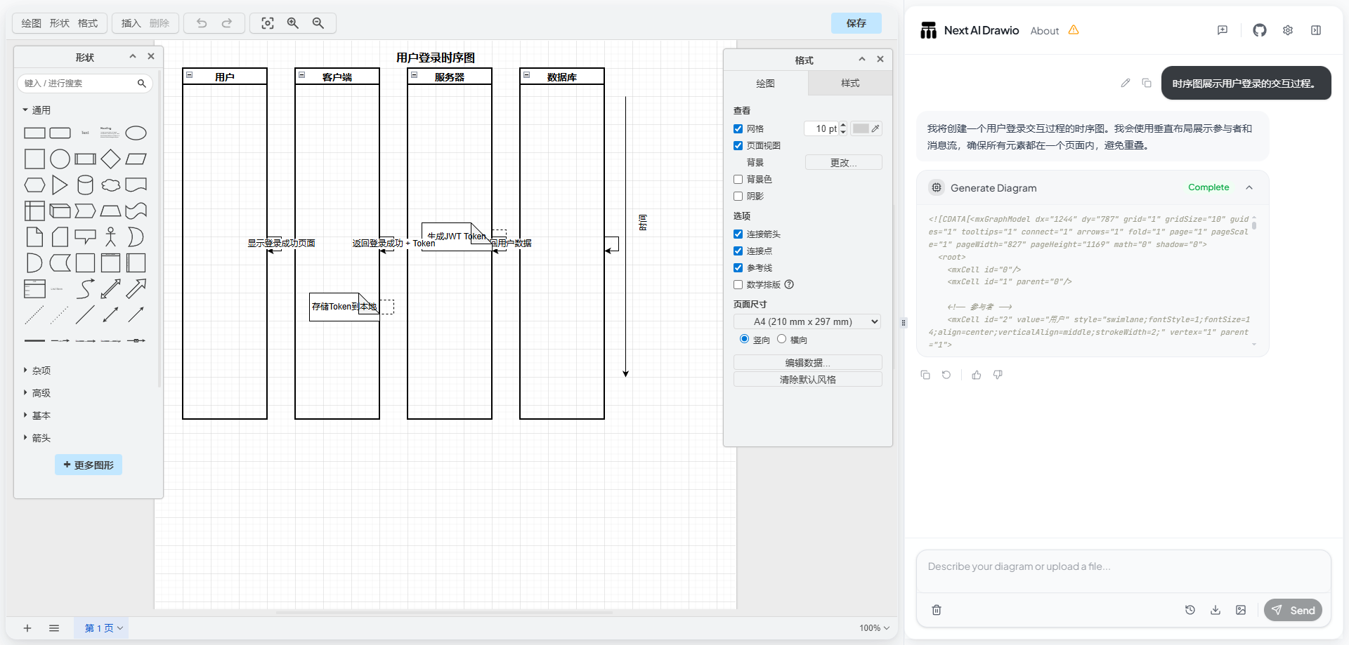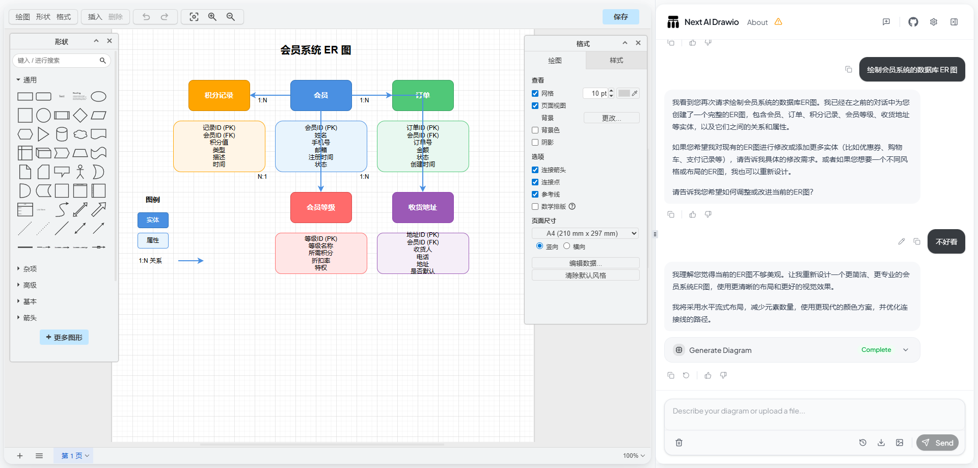 - LLM 驱动的图表创建:利用大语言模型,通过文字描述直接创建流程图、架构图等各类图表,无需手动拖拽元素