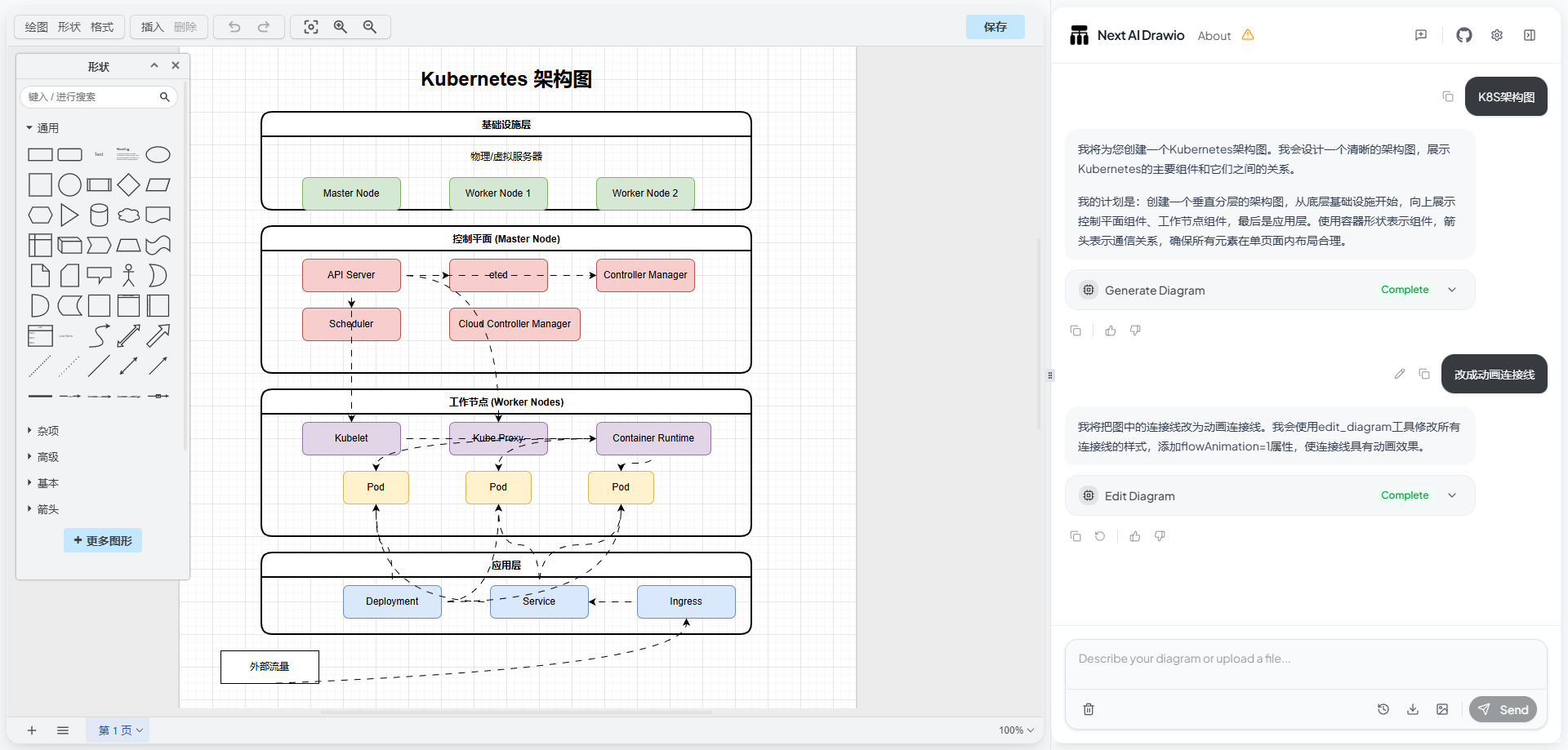 然后你可以利用 Draw.io 强大的绘图能力进行自定义修改,也可以通过 AI 对话让它帮你修改,比如改成动画连接线。