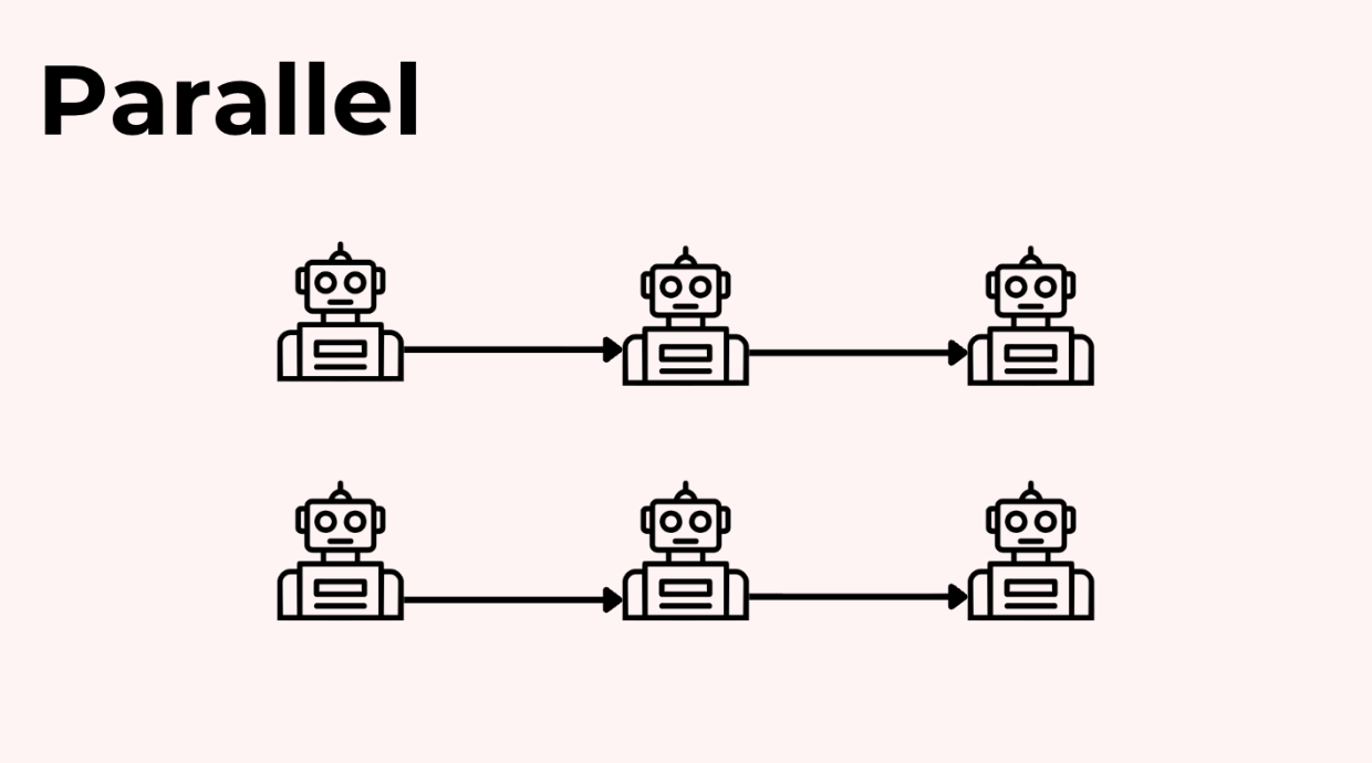 但顺序执行并非唯一选择。当步骤之间相互独立时,你还可以并行运行代理,这对于减少延迟非常有效。