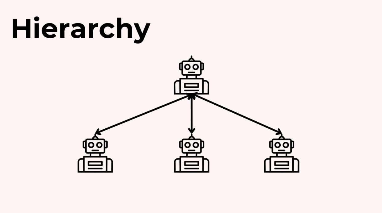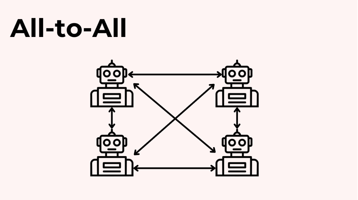 最后,我们有全连接模型,它可能会超级混乱。在这个模型中,任何智能体都可以在任何时候向其他任何智能体发送消息。这种情况在实际生产中很少见,因为它难以预测和控制。每次运行的输出可能会有很大差异。