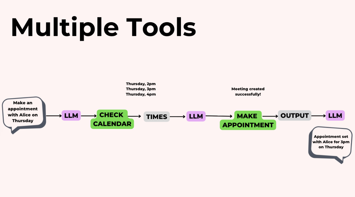 当你为模型提供多个工具时,它可以将这些工具串联起来使用。例如,假设你正在构建一个日历助手。你已经公开了三个工具:checkCalendar(检查日历)、makeAppointment(创建预约)和deleteAppointment(删除预约)。
