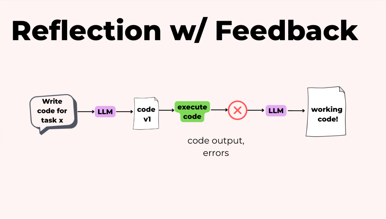 反射在代码中变得非常强大,因为你可以添加外部反馈。你可以编写代码,让一个审查代理对其进行审核,然后实际运行它。这使你能够捕捉错误、测试结果和输出,并将这些反馈给模型。模型可以利用这些具体信息生成更好的版本2。