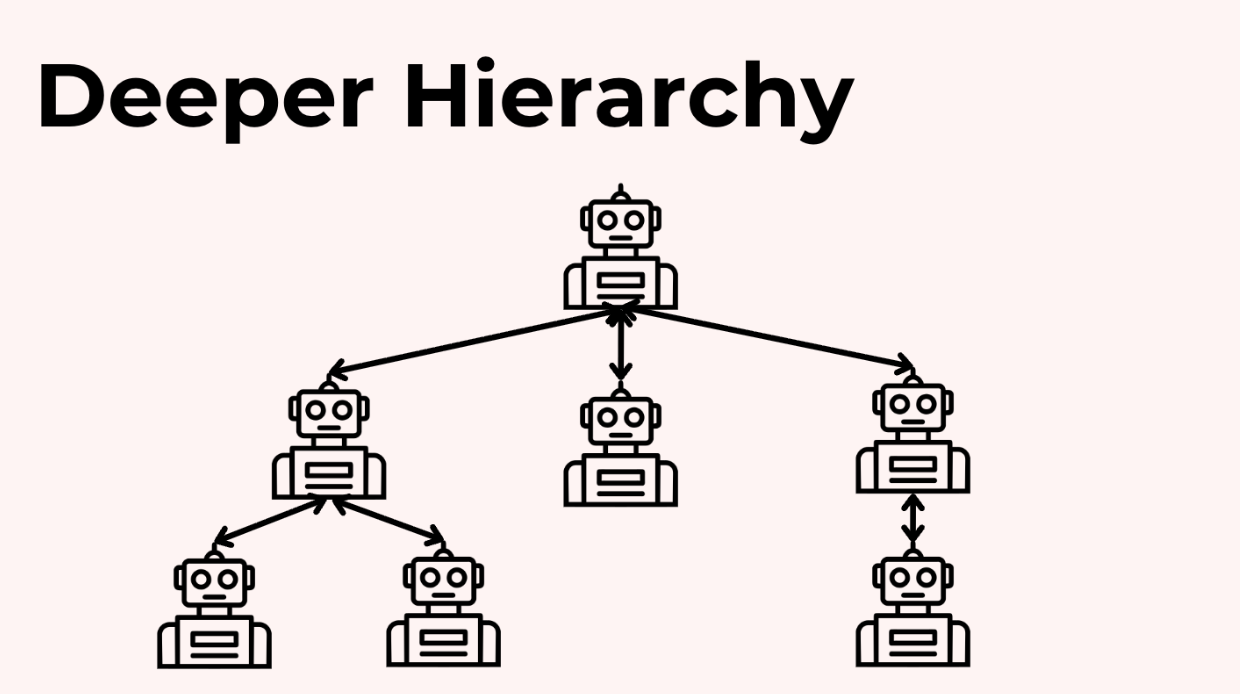 对于更复杂的工作流程,您可以拥有更深层次的层级结构,其中一些代理管理自己的子代理。