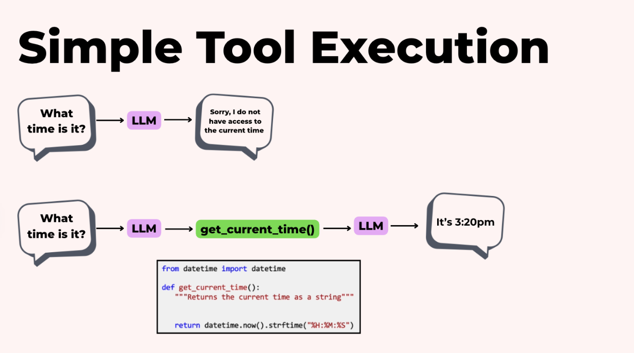这很重要,因为大语言模型本身只是一个文本生成器。它不知道现在是什么时间,也不了解贵公司的销售数据。它无法执行代码来计算确切答案。