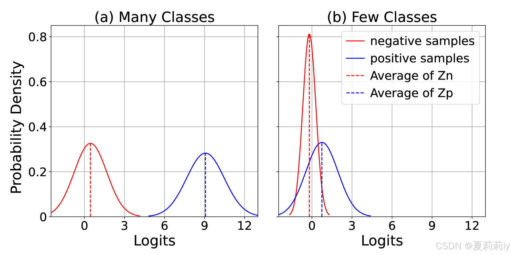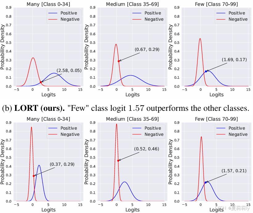 ②VanillaCross-Entropy(CE)和作者提出的logits retargeting approach (LORT)在CIFAR 100-LT对于不同基数类别的正负例logits分布: