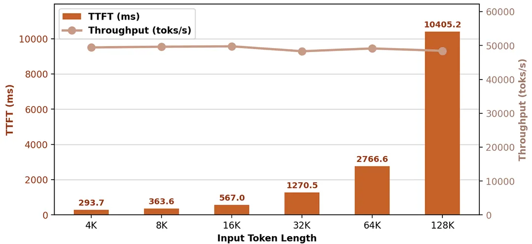 而在 Decode(解码)阶段,即使在 16K 的长上下文背景下,通过 3 层 MTP 加速,单机吞吐依然能维持在 5000 到 15000 tokens/s,单请求吞吐达到 151 到 115 tokens/s。