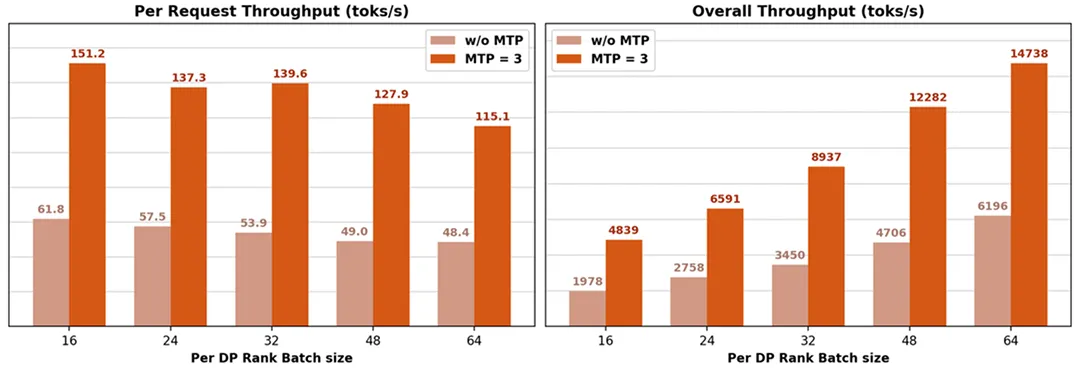 这一技术在大 Batch(批处理)场景下尤为关键。传统解码方式在大 Batch 下会彻底卡死在显存带宽上,而 MTP 提高了单次显存读取的利用率,显著提升了吞吐量。