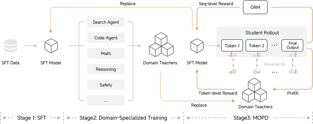 拥有了强大的基座模型和高效的推理架构,如何让模型更聪明?小米提出了一种全新的后训练范式:MOPD(Multi-Teacher On-Policy Distillation)。