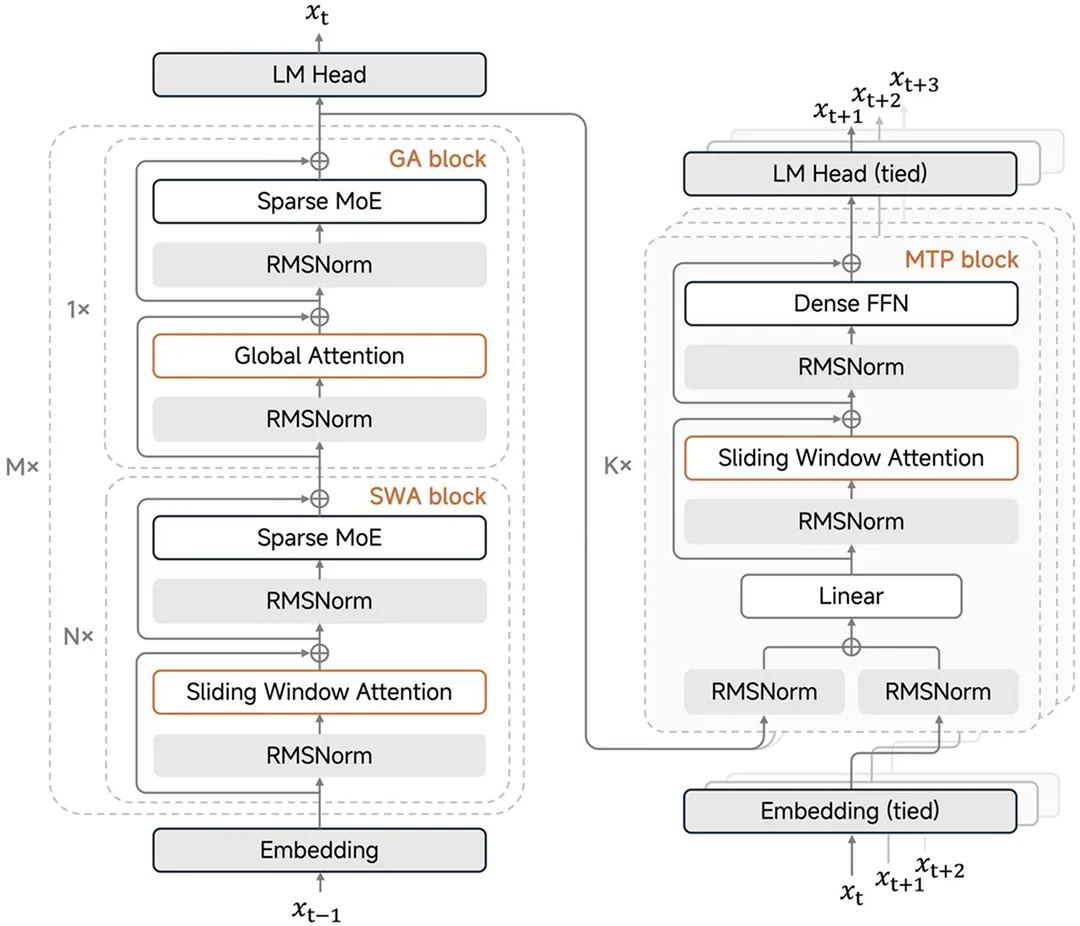MiMo-V2-Flash 在注意力机制上采用了 5:1 的混合注意力结构。它将 Sliding Window Attention(SWA,滑动窗口注意力)与 Global Attention(GA,全局注意力)相结合。