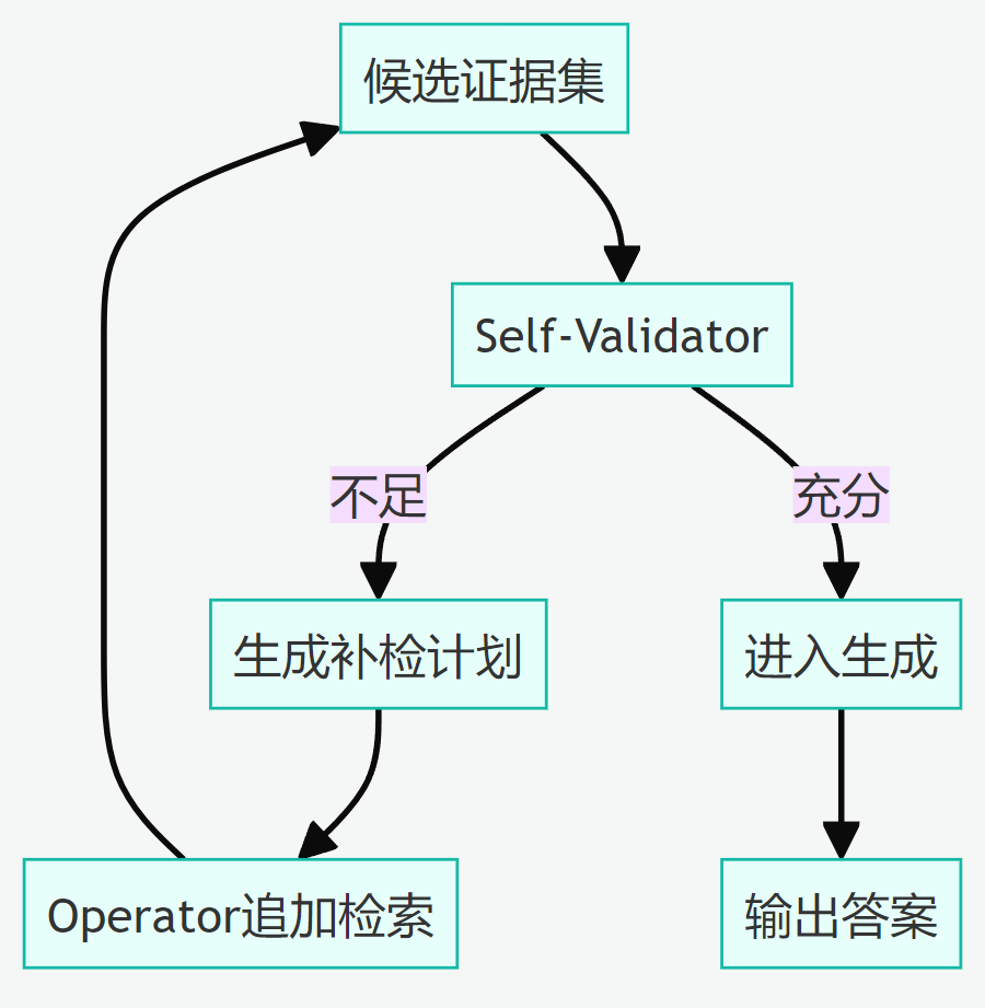 3.Self-Validator执行反思式校验,不足则回指令让Operator追加检索,形成检索—验证—再检索闭环。