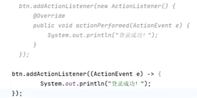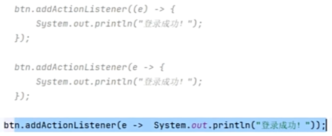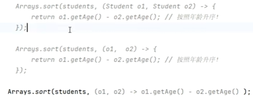 ③如果Lambda表达式中只有一行代码,大括号可以不写,同时要省略分号” ; ” 如果这行代码是return语句,也必须去掉return。