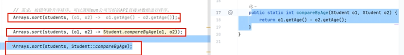 使用场景:如果某个Lambda表达式里只是调用一个静态方法,并且“->”前后参数的形式一致,就可以使用静态方法引用。