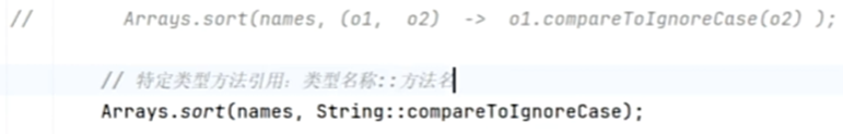 使用场景:如果某个Lambda表达式里只是调用一个特定类型的实例方法,并且前面参数列表中的第一个参数是作为方法的主调,后面的所有参数都是作为该实例方法的入参的,则此时就可以使用特定类型的方法引用。