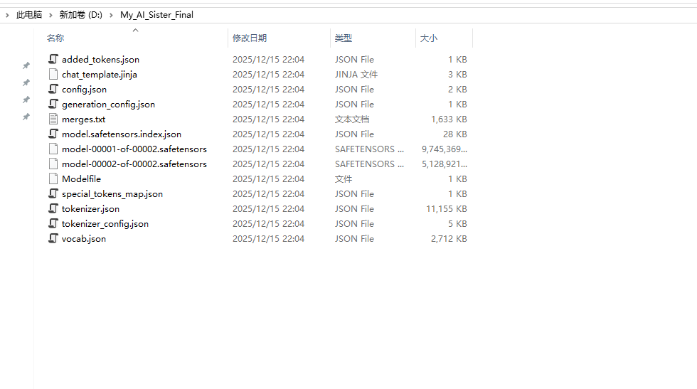 作用:这就是 Qwen2.5 的神经网络参数,加上了你训练进去的 LoRA 记忆。因为模型比较大(约 15GB),为了方便读取,它被切成了两块(分卷)。