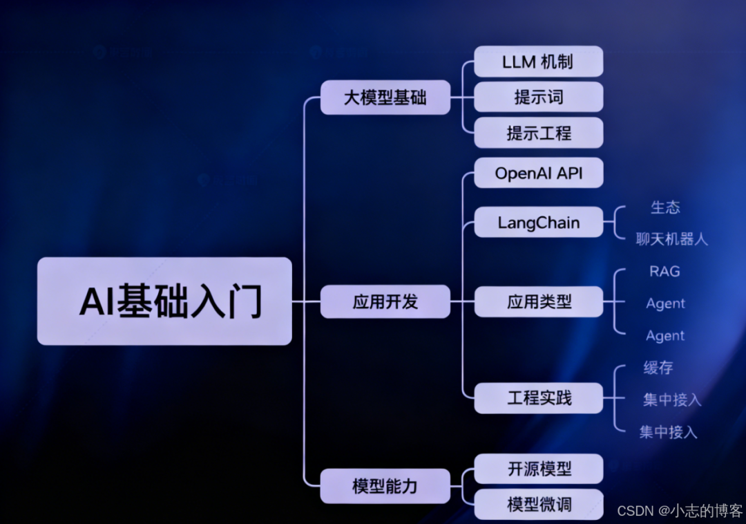 - 应用开发部分是核心,主要会站在应用开发者的角度,介绍两个我们会用到的 API:Open AI 的 API 和 LangChain。