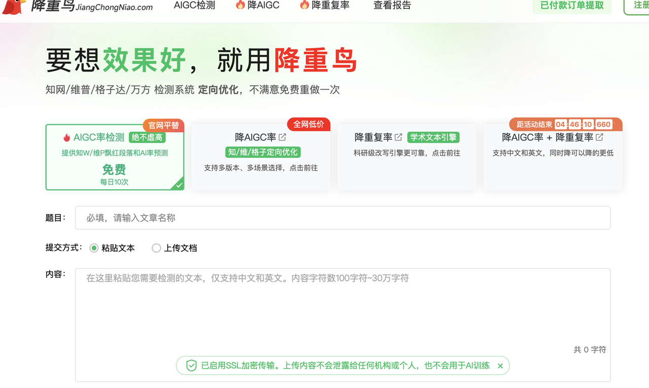 2、降重鸟: 主打一个“快”。界面极其简单,粘进去几秒出结果。适合平时做作业糊弄一下,长篇论文慎用,逻辑容易断裂。