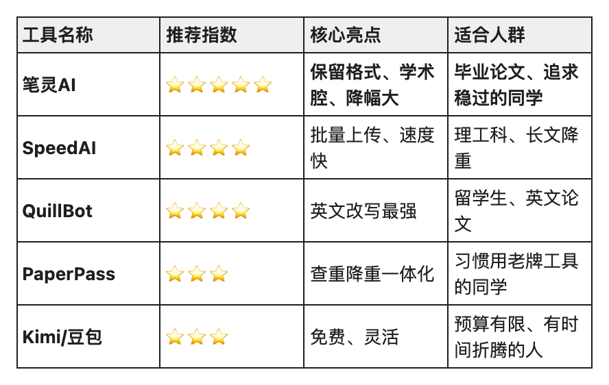 ⚡ 免费/尝鲜派:Kimi / 豆包 / 降重鸟
