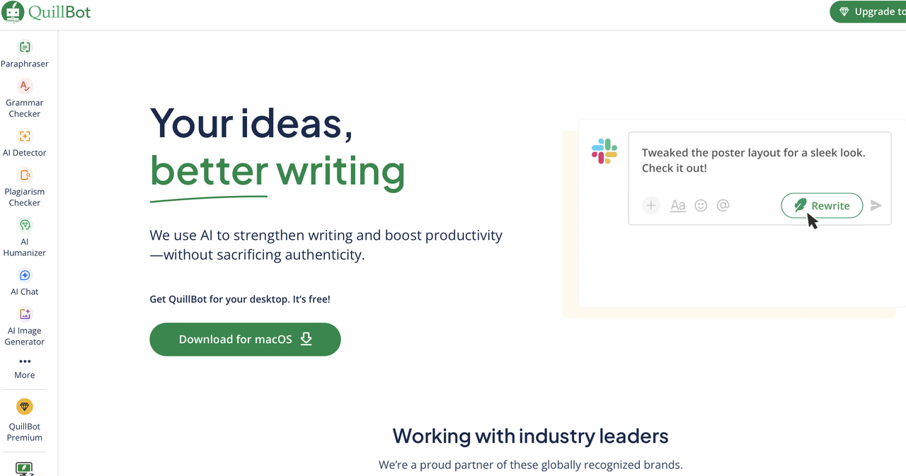1、QuillBot (https://quillbot.com/): 主打Paraphrasing(改写)。学术模式(Academic Mode)非常强,用词地道。