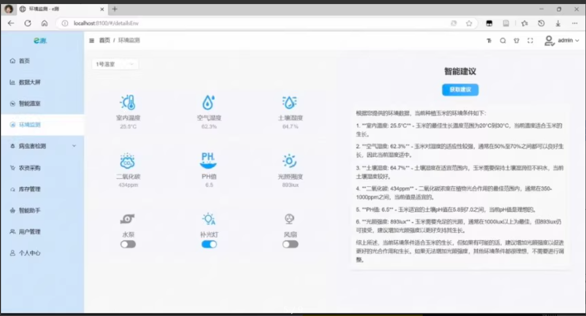 智能环境监控与联动:智能温室环境检测模块实时采集并展示各监测点的空气温湿度、土壤温湿度、光照强度、CO₂浓度等数据。系统不仅能进行阈值告警,更能基于环境数据模型与作物生长模型,获取实时农事建议,例如自动提示“当前温湿度利于白粉病发生,建议午后通风降湿”。