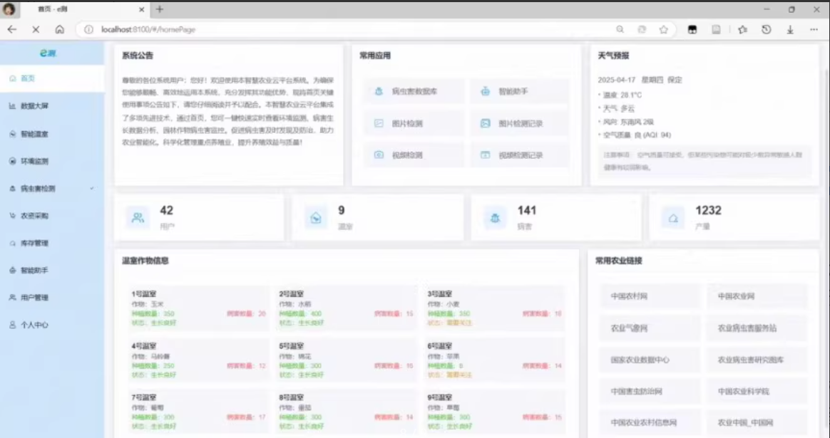 该平台通过上述技术实现与功能设计,不仅提供了强大的病虫害智能识别与环境数据分析能力,更以安全、友好、灵活的前端交互,满足了不同角色用户的专业化需求,是一套集技术前瞻性、功能实用性与体验卓越性于一体的综合性智慧农业解决方案。