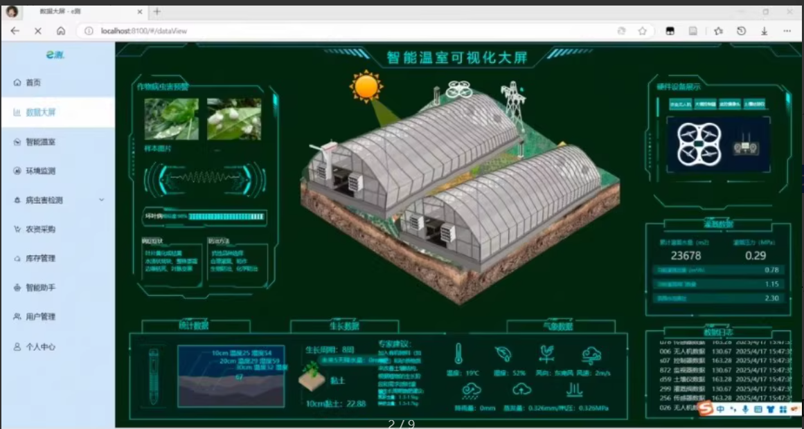 综合概览与决策指挥(首页与数据大屏):系统首页为用户提供个性化的数据看板,汇总关键指标。专设的“数据大屏”模式,面向农场管理者或指挥中心,以驾驶舱的形式动态、可视化地展示全域温室状态、作物健康总览、实时预警统计、环境参数热力图等宏观信息,支持决策研判。
