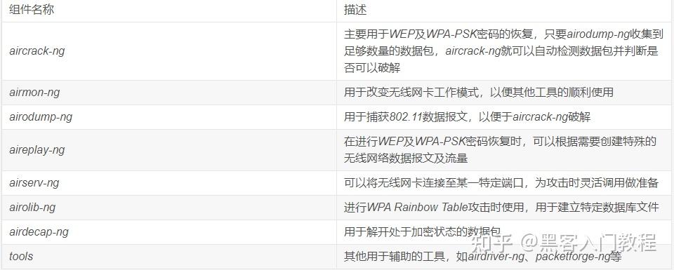 Aircrack-ng(注意大小写)是一个包含了多款工具的无线攻击审计套装,这里面很多工具在后面的内容中都会用到,具体见下表1为Aircrack-ng包含的组件具体列表。