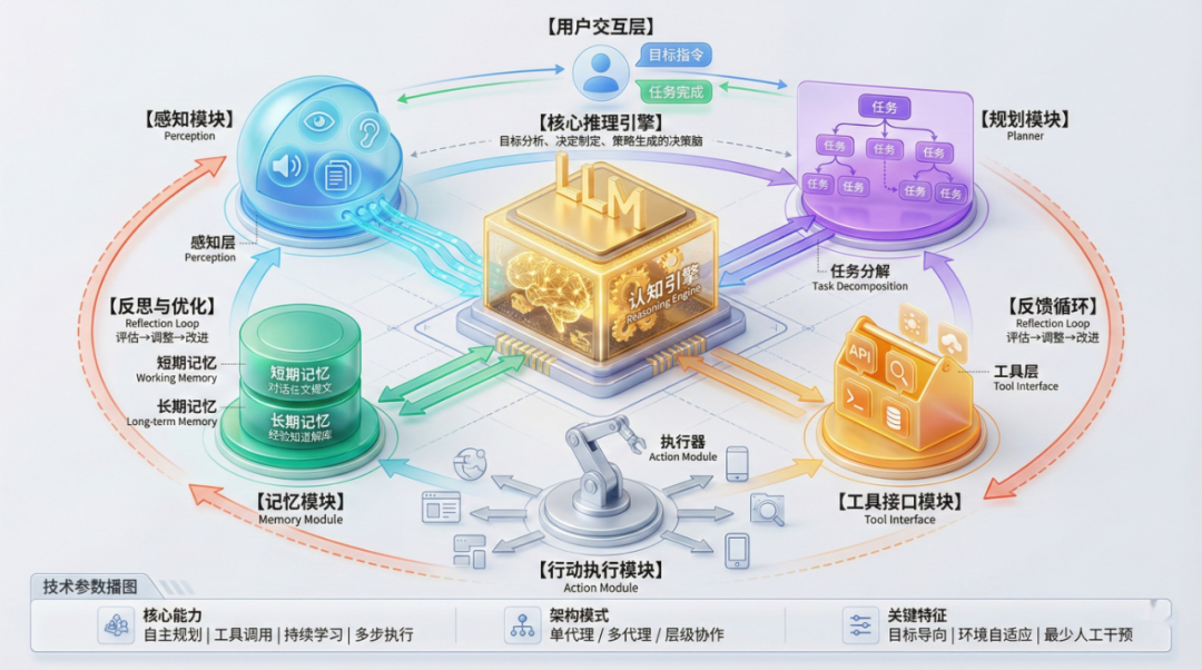 Agentic AI 的核心是一个自主决策循环。它不是简单的"输入-输出"模式,而是持续运行的四步循环:Agentic AI 工作循环感知环境Perceive推理决策Reason执行动作Act观察反馈Observe最小化人工干预的自主决策循环感知环境 (Perceive):Agent 观察当前状态——可能是用户的请求、系统的状态、或者外部 API 的返回结果推理决策 (Reason):基于观察到的