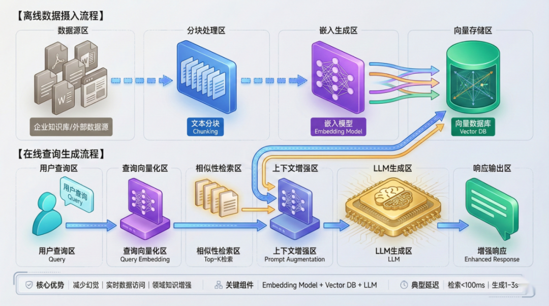 RAG 本质上是一个"外挂知识库"系统,让 LLM 能够访问训练数据之外的信息。它分为两个阶段: