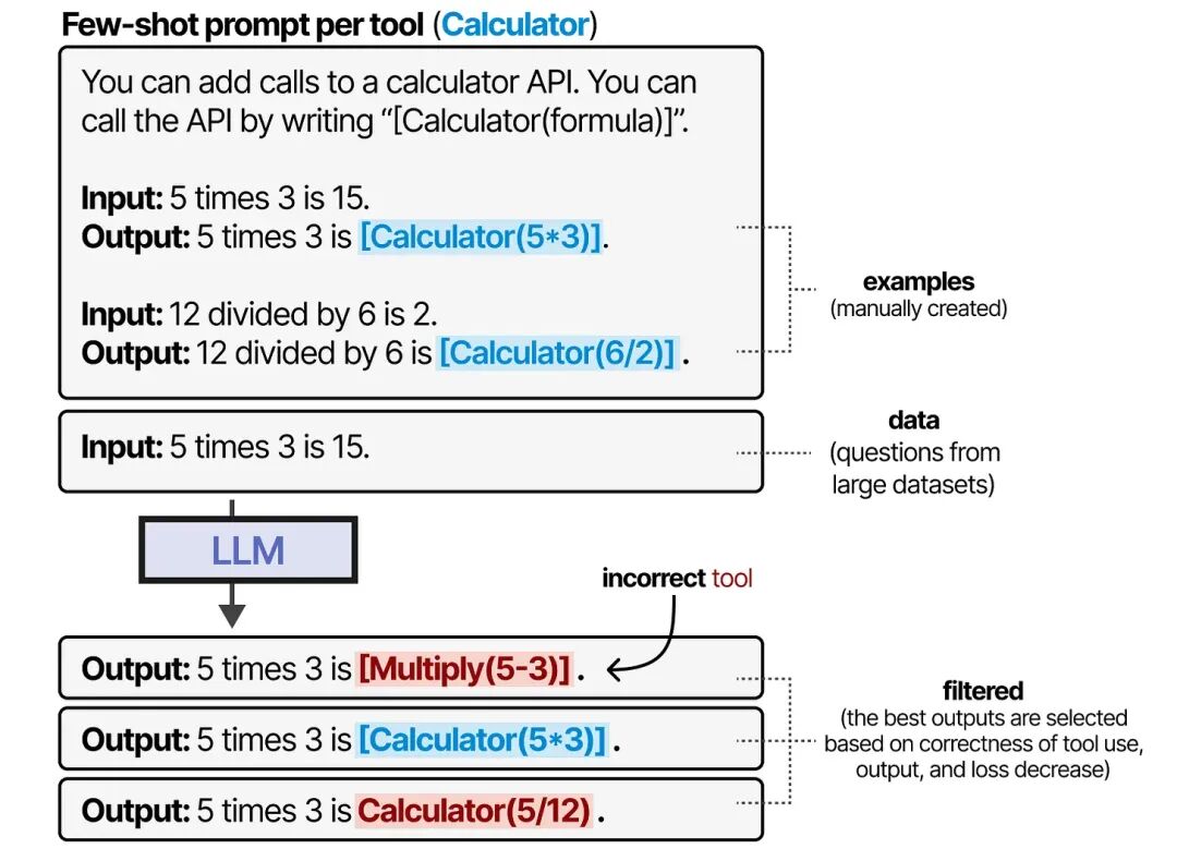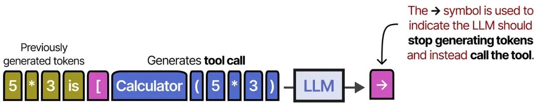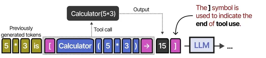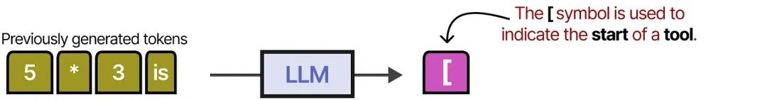 其中较早引人注目的一项技术叫做 Toolformer。它训练 LLM 学会决定应该调用哪些 API,以及如何调用。Toolformer 的实现思路是:利用特殊的标记来指示何时调用工具以及何时结束调用。举例来说,当输入问题“5 乘以 3 等于多少?”时,模型会开始生成回答,一直生成到出现一个“[”符号——这个符号表示模型决定去调用某个工具。