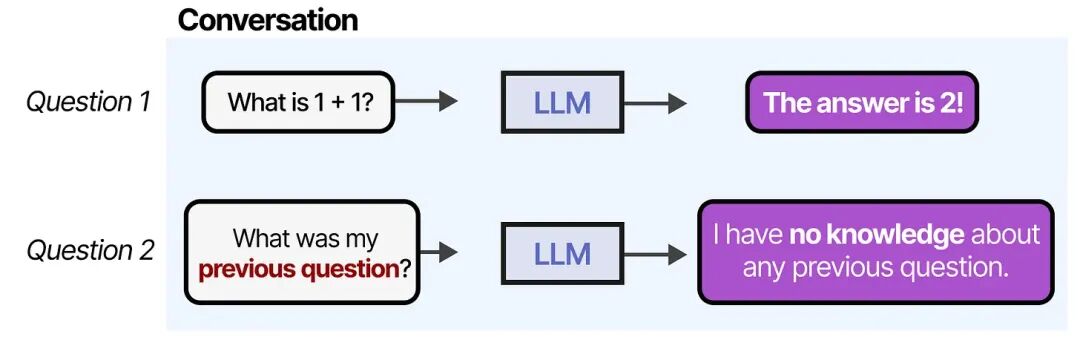 传统 LLM 本身是没有记忆的系统,在与其交互的过程中,模型并不会主动记住先前发生的事情。举个例子,当你问传统 LLM 一个问题,然后紧接着又问了第二个问题,它通常并不会记得第一个问题的内容。