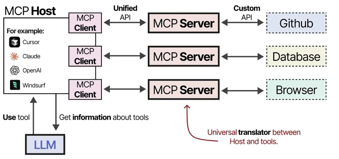 通过引入 MCP 这一框架让创建和使用工具变得更加容易。你可以开发一个与某服务交互的 MCP 服务器,例如用于访问 GitHub 的接口,那么任何支持 MCP 协议的 LLM 应用程序都可以连上这个服务器并使用该功能。换句话说,开发一次,处处可用。