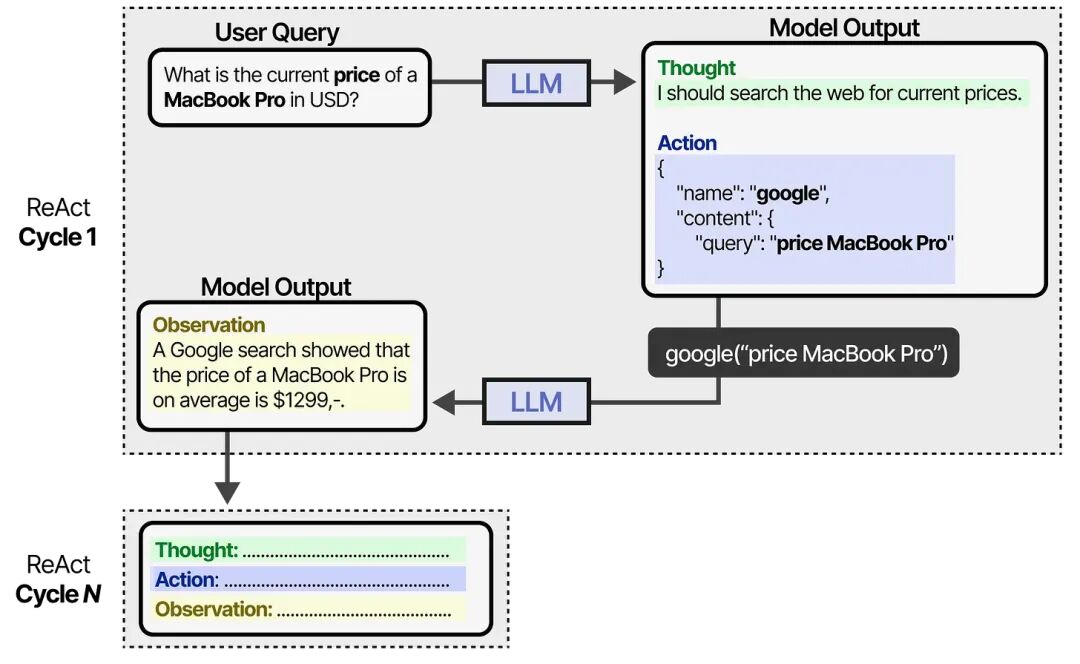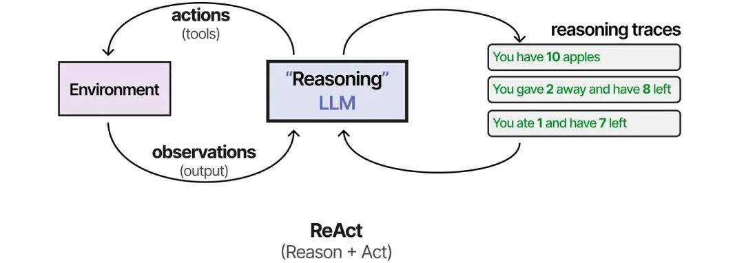 然而,我们需要的是让模型既能思考,又能行动。最早将思考和行动结合起来的技术之一叫做 ReAct(Reason + Act)。