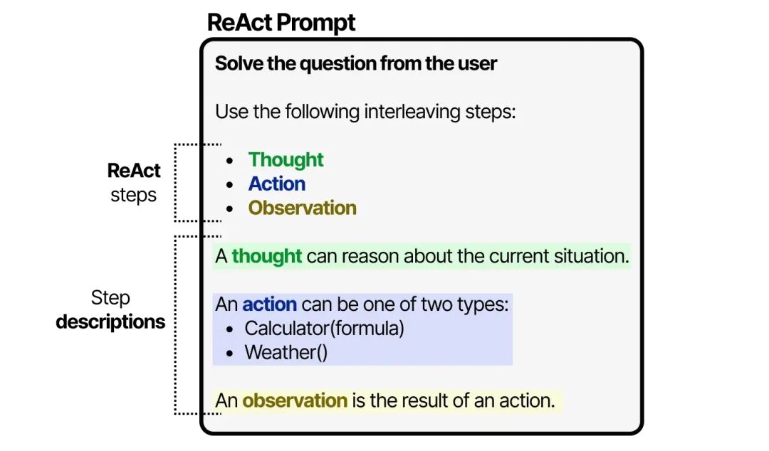 LLM 按照该提示来约束自己的行为,使其循环遵循“思考 - 行动 - 观察”的模式。