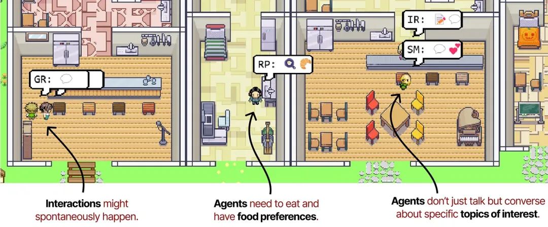 凭借这些机制,这些生成式智能体能够自由地按照各自的人设与动机行动,并彼此之间进行互动。值得一提的是,在这个框架中并没有赋予智能体一个预定的共同目标,因此整个系统几乎不需要专门的全局协调,每个智能体都按照自身的角色和经验自主行动。