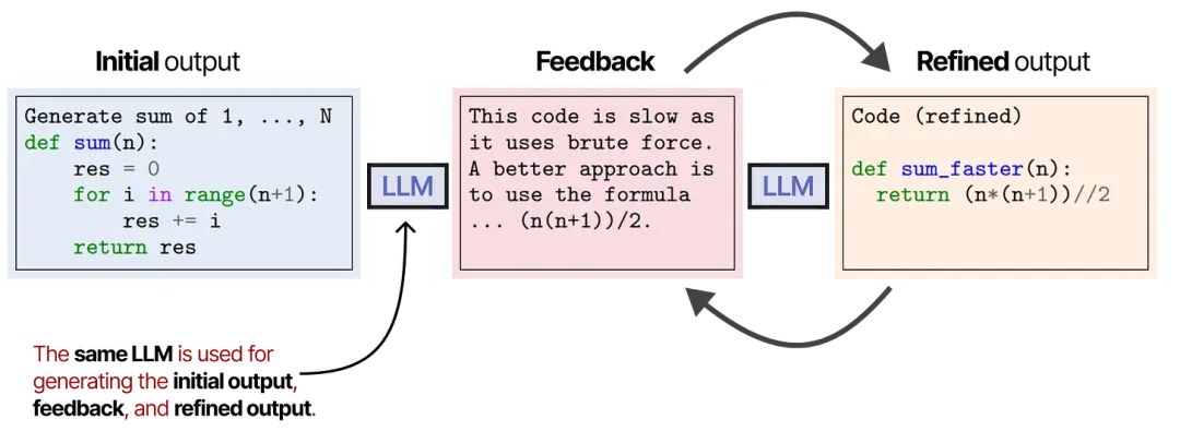 在这个过程中,初始回答、改进后的回答以及反馈意见都是由同一个模型依次产出的。