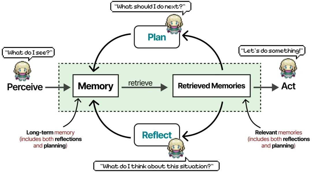 在这个系统中,每个生成式智能体在初始化时都会被赋予详细的人物设定,这使得不同的智能体表现出独一无二的行为特点,也让整个模拟环境中的交互更加有趣和生动。每个智能体启动时都具备三个核心模块:记忆、规划和反思——这和之前在 ReAct 与 Reflexion 框架中看到的核心部分非常相似。